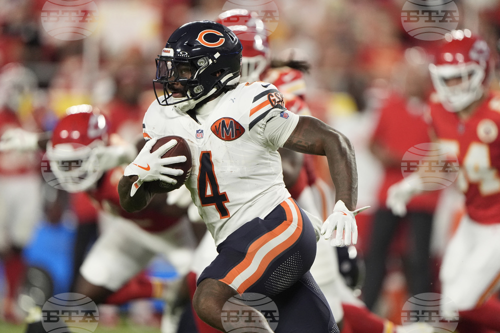 Chicago Bears running back D'Andre Swift (4) runs with the ball during the first half of a preseason NFL football game against the Kansas City Chiefs Friday, Aug. 22, 2025, in Kansas City, Mo. (AP Photo/Charlie Riedel)
