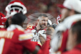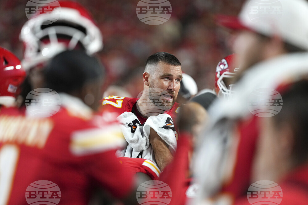 Kansas City Chiefs tight end Travis Kelce is seen in the bench area during the first half of a preseason NFL football game against the Chicago Bears Friday, Aug. 22, 2025, in Kansas City, Mo. (AP Photo/Ed Zurga)