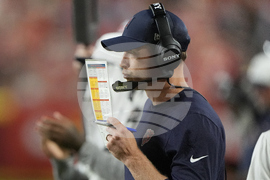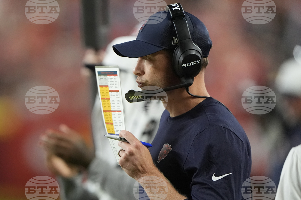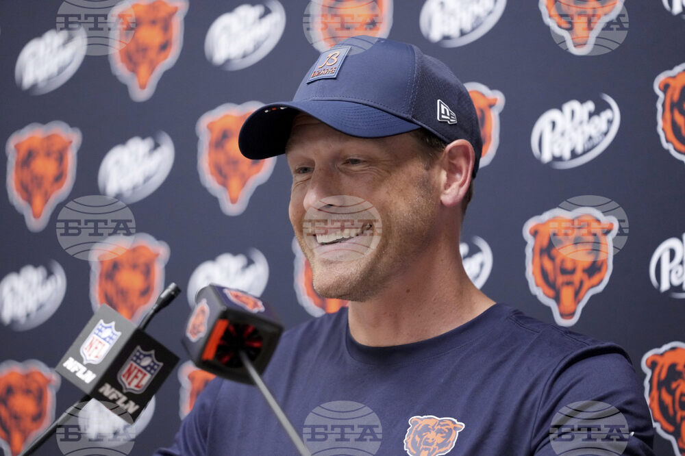 Chicago Bears head coach Ben Johnson speaks during a news conference following a preseason NFL football game against the Kansas City Chiefs Friday, Aug. 22, 2025, in Kansas City, Mo. (AP Photo/Ed Zurga)