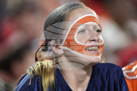 A Chicago Bears fans is seen in the stands during the second half of a preseason NFL football game between the Kansas City Chiefs and the Chicago Bears Friday, Aug. 22, 2025, in Kansas City, Mo. (AP Photo/Charlie Riedel)