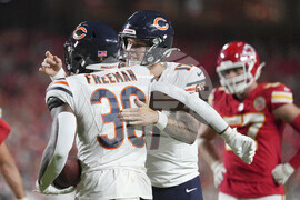 Chicago Bears running back Royce Freeman is congratulated by quarterback Tyson Bagent (17) after catching a touchdown pass during the second half of a preseason NFL football game Friday, Aug. 22, 2025, in Kansas City, Mo. (AP Photo/Ed Zurga)
