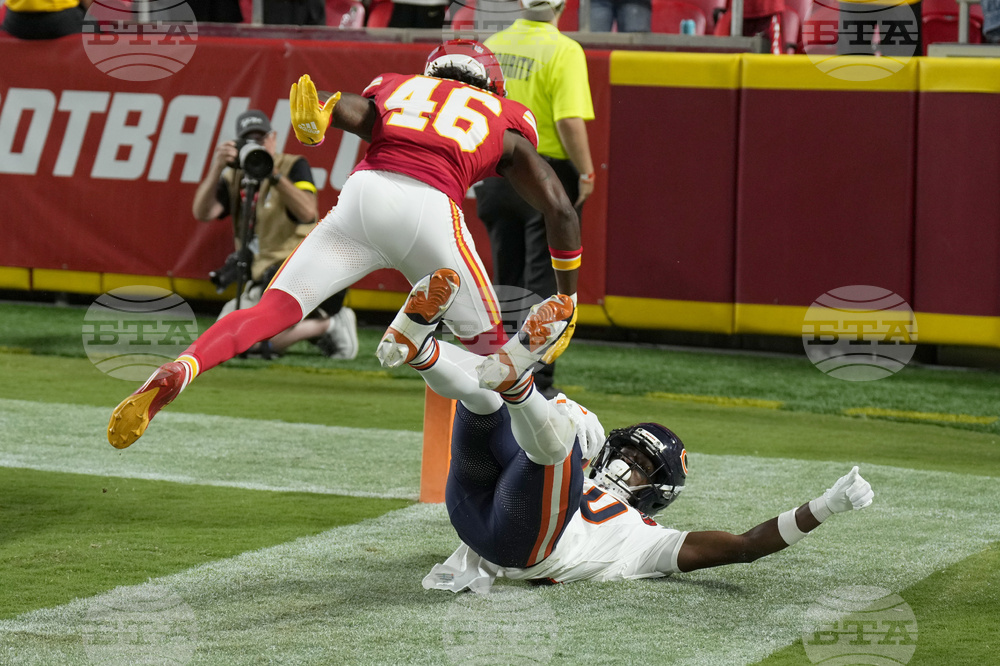 Kansas City Chiefs wide receiver Jason Brownlee (89) is unable to catch a pass in the end zone as Chicago Bears defensive back Mekhi Garner defends during the first half of a preseason NFL football game Friday, Aug. 22, 2025, in Kansas City, Mo. (AP Photo/Charlie Riedel)