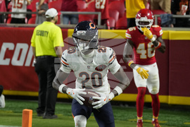 Chicago Bears running back Royce Freeman celebrates after scoring during the second half of a preseason NFL football game against the Kansas City Chiefs Friday, Aug. 22, 2025, in Kansas City, Mo. (AP Photo/Charlie Riedel)