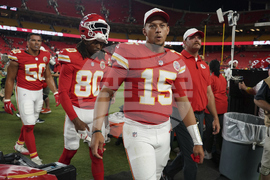 Kansas City Chiefs quarterback Patrick Mahomes heads off the field following a preseason NFL football game against the Chicago Bears Friday, Aug. 22, 2025, in Kansas City, Mo. (AP Photo/Ed Zurga)