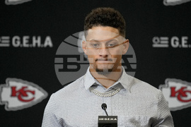 Kansas City Chiefs quarterback Patrick Mahomes speaks during a news conference following a preseason NFL football game against the Chicago Bears Friday, Aug. 22, 2025, in Kansas City, Mo. (AP Photo/Charlie Riedel)