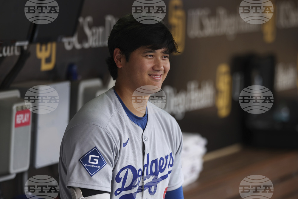 Los Angeles Dodgers' Shohei Ohtani smiles in the dugout prior to a baseball game against the San Diego Padres, Saturday, Aug. 23, 2025, in San Diego. (AP Photo/Derrick Tuskan)