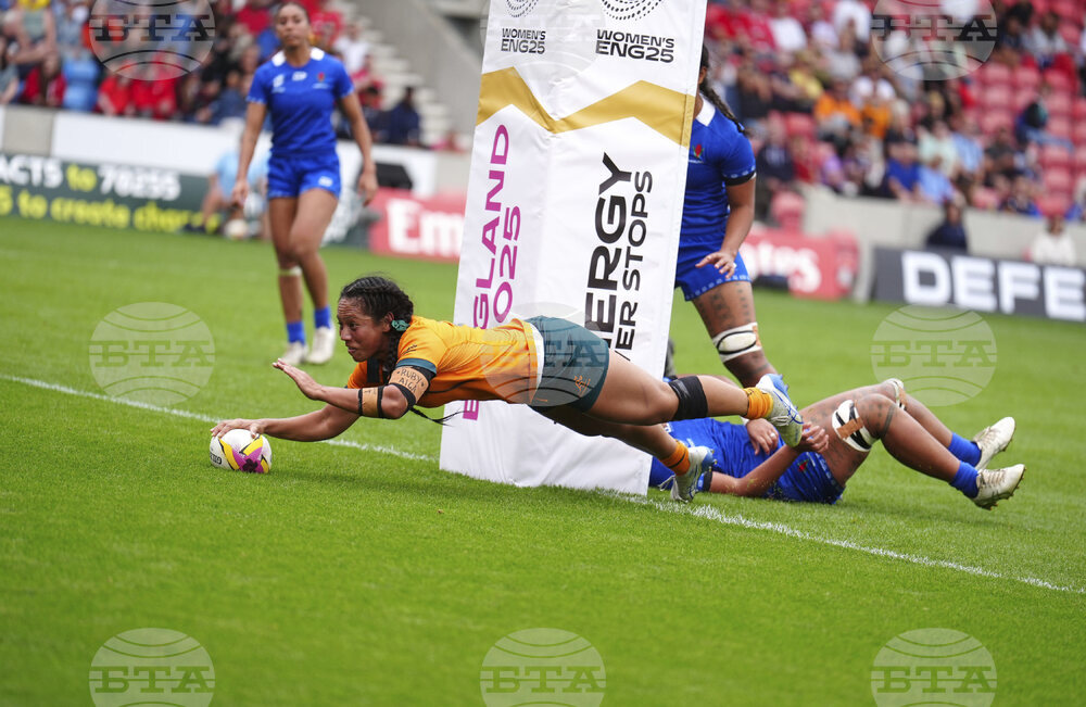 Cecilia Smith of Australia, center, is tackled by Sui Pauaraisa of Samoa during the group A match at the 2025 Women's Rugby World Cup between Australia and Samoa in Manchester, England, Saturday, Aug. 23, 2025. (AP Photo/Dave Shopland)