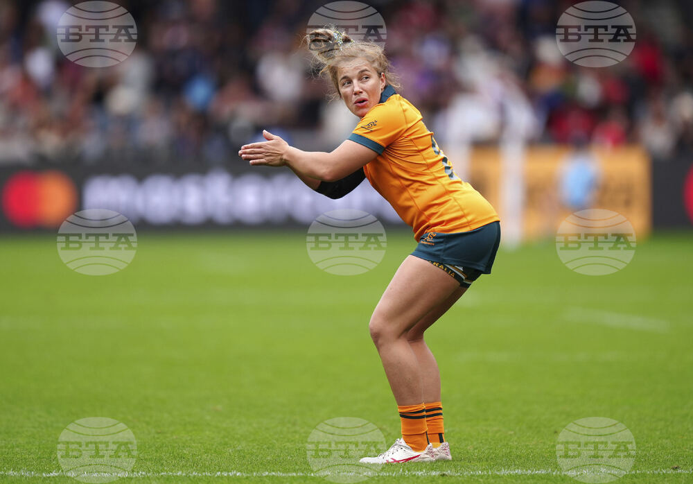 Australia's Lori Cramer prepares to take a kick during the Women's Rugby World Cup 2025 Pool A match at the Salford Community Stadium in Salford, England, Saturday, Aug. 23, 2025. (Mike Egerton/PA via AP)