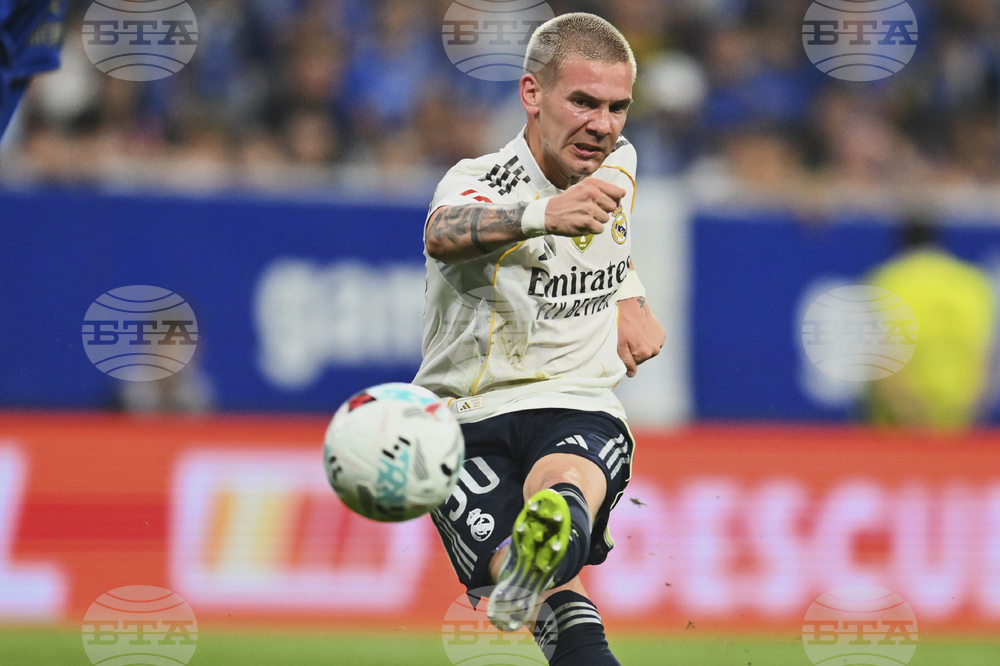 Real Madrid's Franco Mastantuono attempts a shot on goal during a Spanish La Liga soccer match between Real Oviedo and Real Madrid at Carlos Tartiere stadium in Oviedo, Spain, Sunday, Aug. 24, 2025. (AP Photo/Miguel Oses)