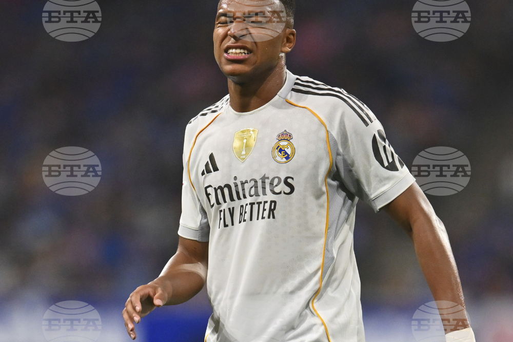 Real Madrid's Kylian Mbappe gestures during a Spanish La Liga soccer match between Real Oviedo and Real Madrid at Carlos Tartiere stadium in Oviedo, Spain, Sunday, Aug. 24, 2025. (AP Photo/Miguel Oses)