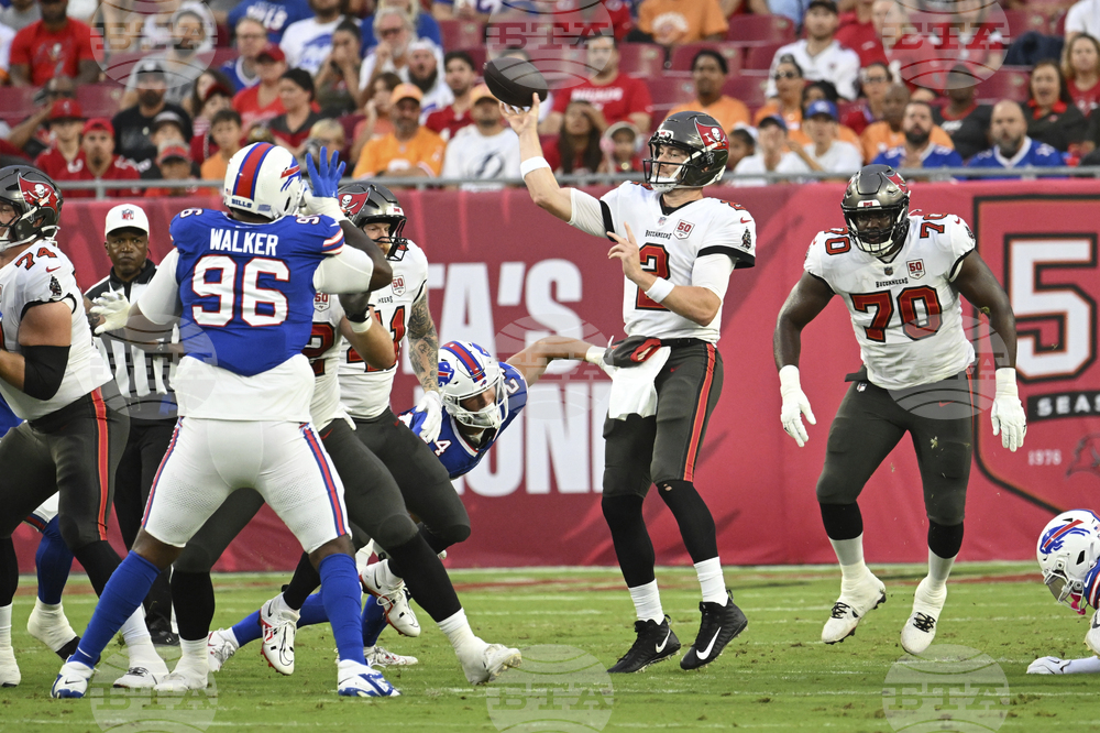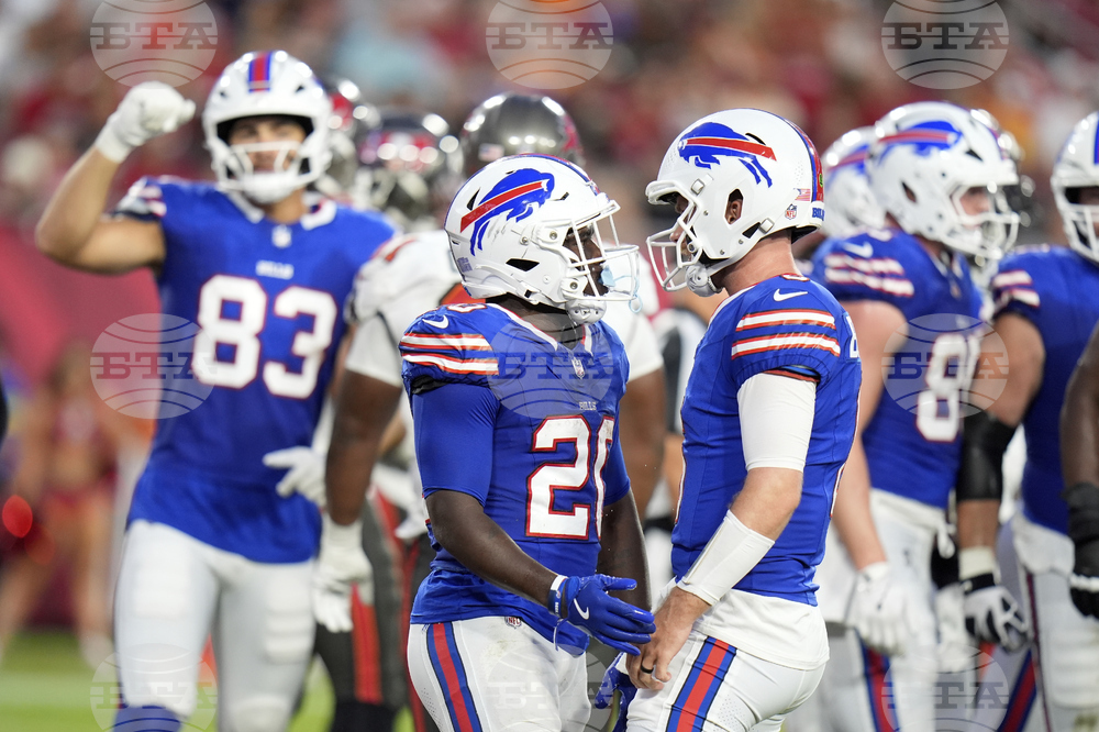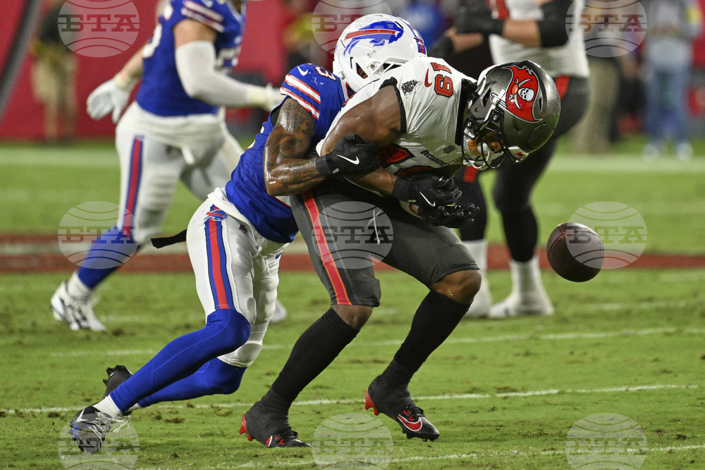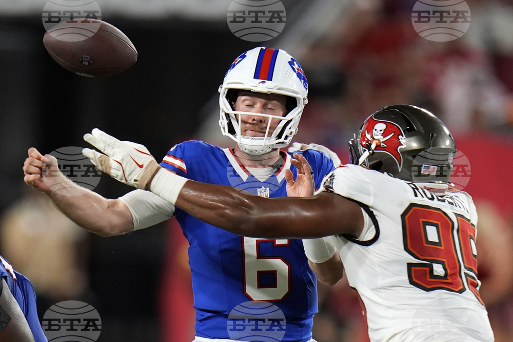 Tampa Bay Buccaneers defensive end Elijah Roberts hits Buffalo Bills quarterback Shane Buechele during the first half of an NFL preseason football game, Saturday, Aug. 23, 2025, in Tampa, Fla. (AP Photo/Chris O'Meara)