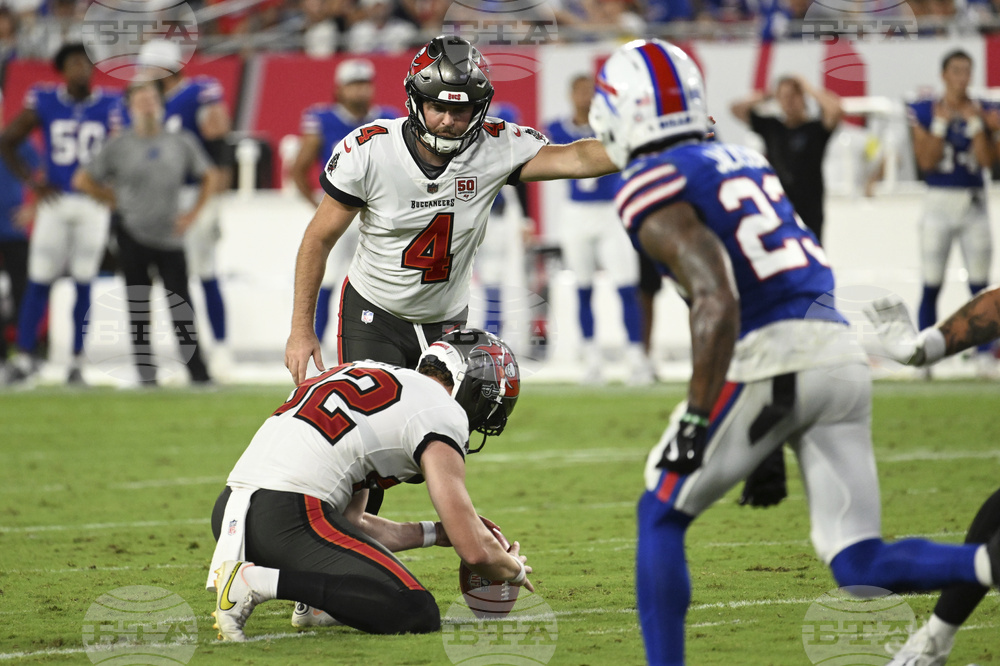 Tampa Bay Buccaneers kicker Chase McLaughlin kicks a field goal against the Buffalo Bills during the first half of an NFL preseason football game, Saturday, Aug. 23, 2025, in Tampa, Fla. (AP Photo/Jason Behnken)