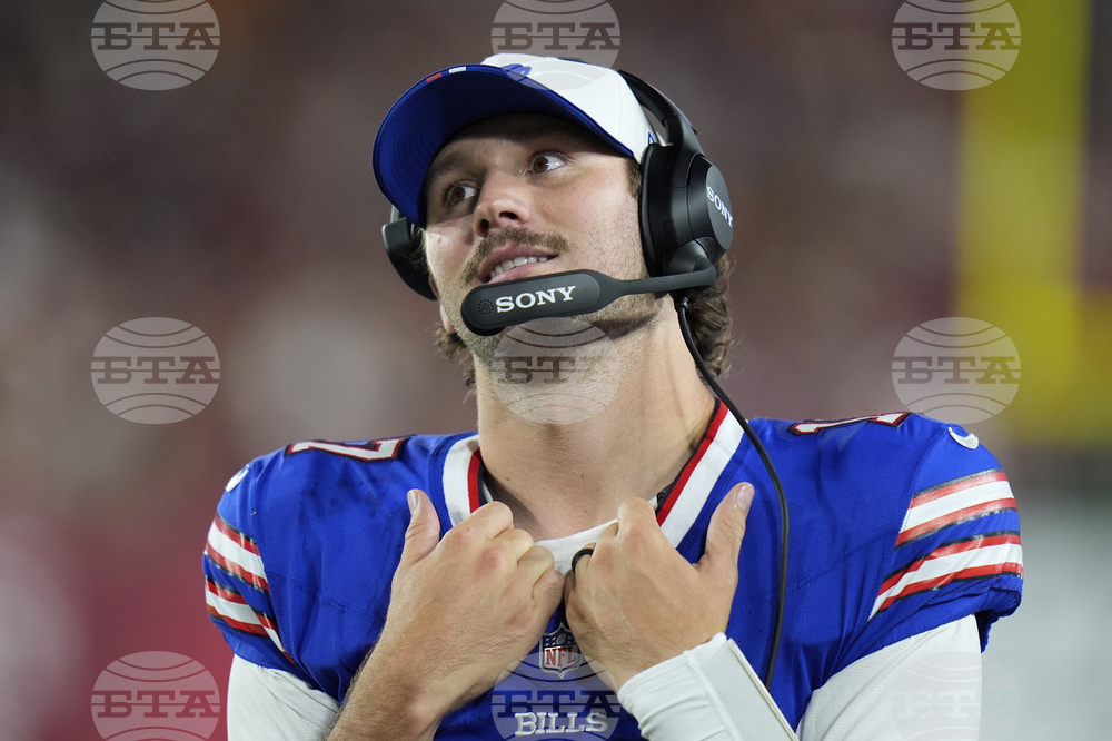 Buffalo Bills quarterback Josh Allen watches during the first half of an NFL preseason football game against the Tampa Bay Buccaneers, Saturday, Aug. 23, 2025, in Tampa, Fla. (AP Photo/Chris O'Meara)