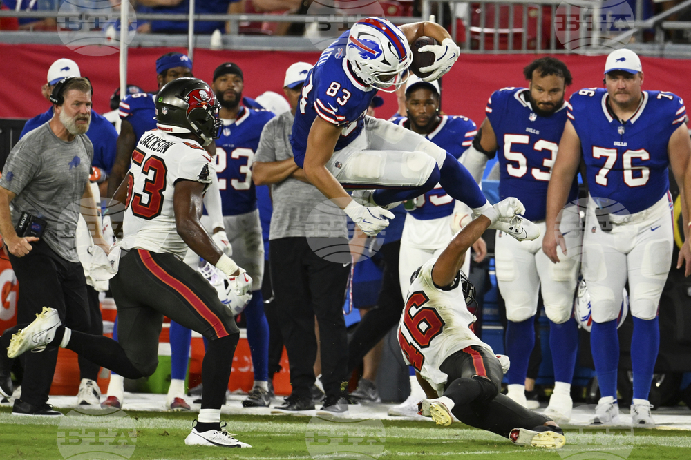 Tampa Bay Buccaneers wide receiver Ryan Miller is tackled by Buffalo Bills safety Cole Bishop during the first half of an NFL preseason football game, Saturday, Aug. 23, 2025, in Tampa, Fla. (AP Photo/Jason Behnken)