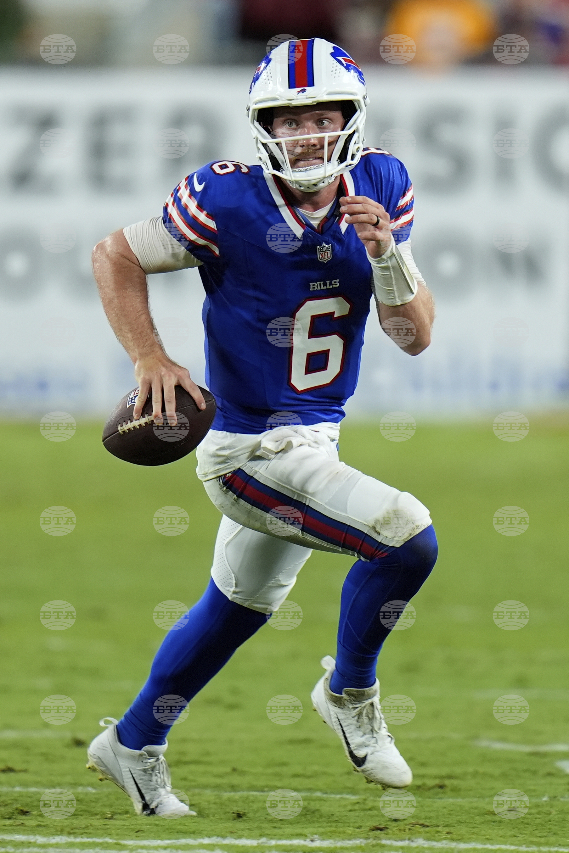 Buffalo Bills quarterback Shane Buechele plays against the Tampa Bay Buccaneers during the second half of an NFL preseason football game, Saturday, Aug. 23, 2025, in Tampa, Fla. (AP Photo/Chris O'Meara)