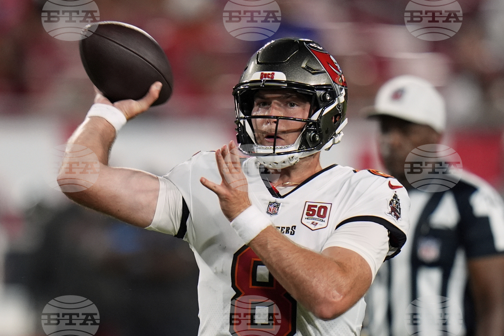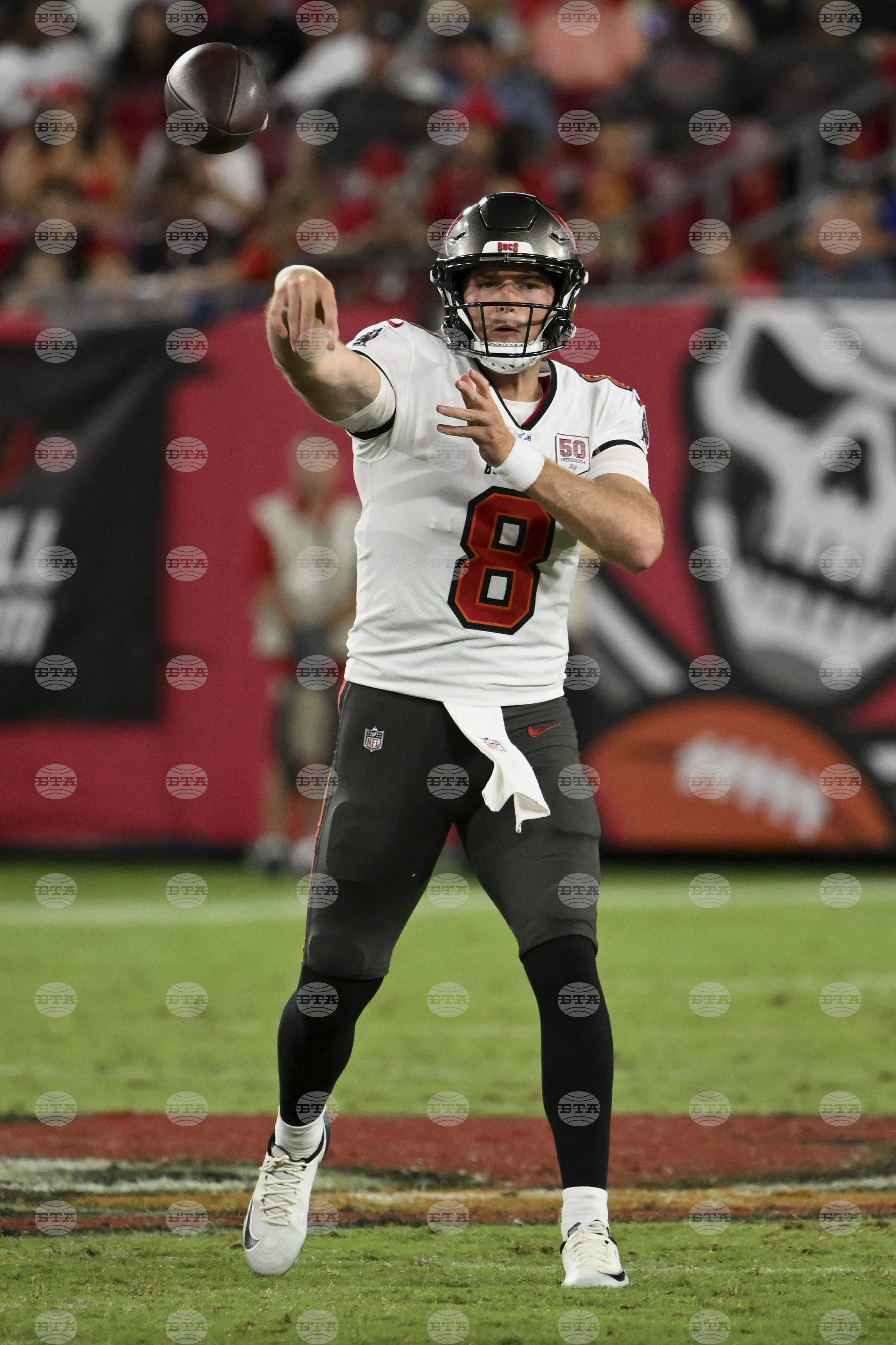Tampa Bay Buccaneers quarterback Kyle Trask passes against the Buffalo Bills an NFL preseason football game between the Tampa Bay Buccaneers and the Buffalo Bills, Saturday, Aug. 23, 2025, in Tampa, Fla. (AP Photo/Jason Behnken)