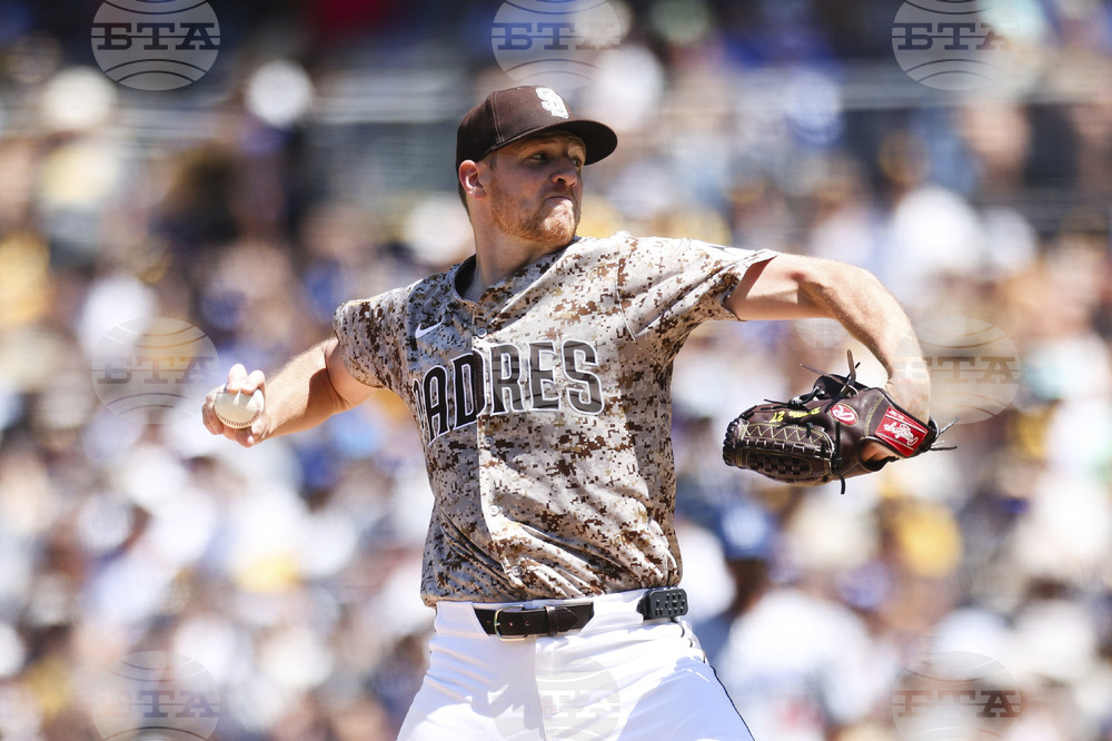 San Diego Padres starting pitcher Nick Pivetta works against the Los Angeles Dodgers in the first inning of a baseball game Sunday, Aug. 24, 2025, in San Diego. (AP Photo/Derrick Tuskan)