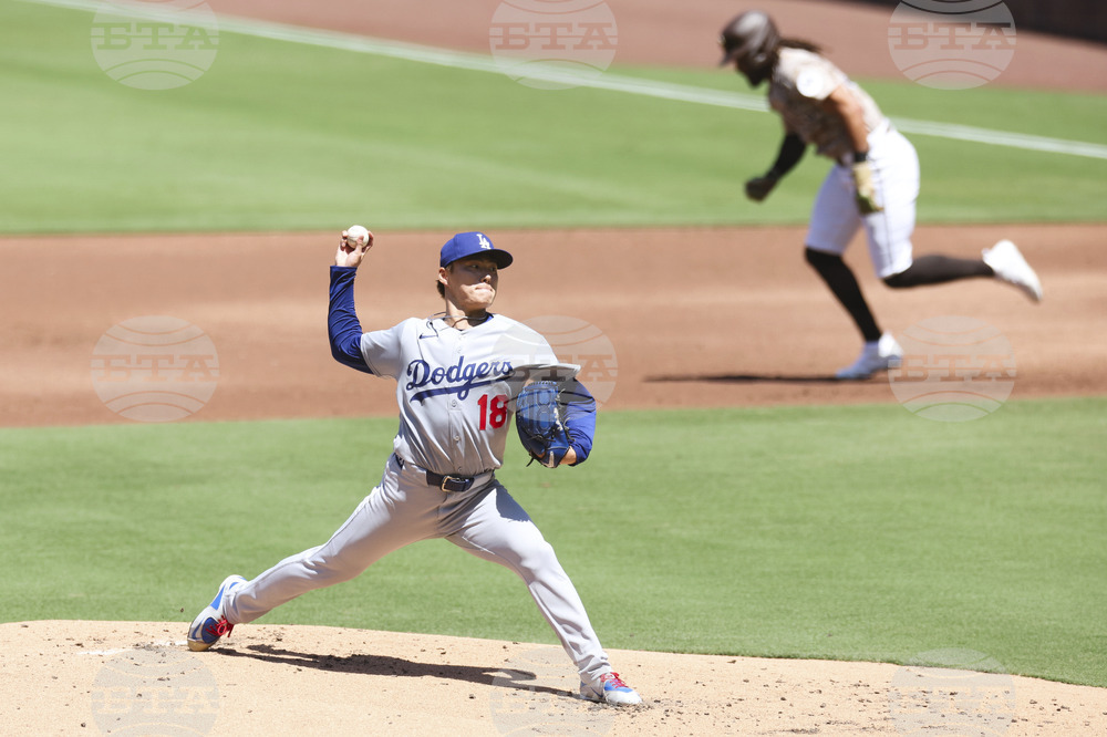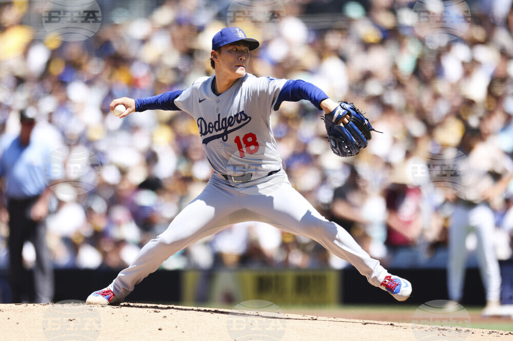 Los Angeles Dodgers starting pitcher Yoshinobu Yamamoto works against the San Diego Padres in the first inning of a baseball game Sunday, Aug. 24, 2025, in San Diego. (AP Photo/Derrick Tuskan)