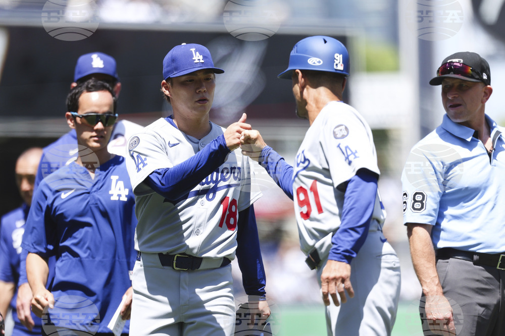 Los Angeles Dodgers starting pitcher Yoshinobu Yamamoto (18) fist-bumps third base coachDino Ebel (91) as umpire Chris Guccione, right,looks on prior to a baseball game against the San Diego Padres, Sunday, Aug. 24, 2025, in San Diego. (AP Photo/Derrick Tuskan)