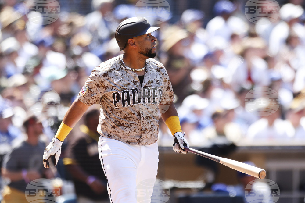 San Diego Padres' Ramon Laureano, right, hits a two-RBI single against the Los Angeles Dodgers in the fourth inning of a baseball game Saturday, Aug. 23, 2025, in San Diego. (AP Photo/Derrick Tuskan)