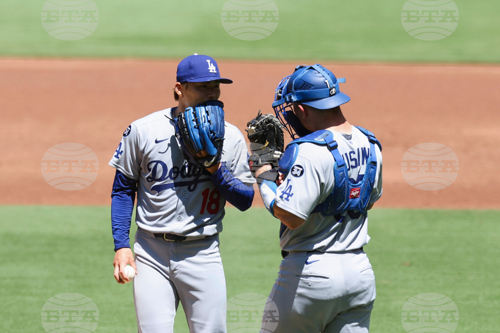 Los Angeles Dodgers' Yoshinobu Yamamoto, left, is visited at the mound by Dalton Rushing, right, in the first inning of a baseball game Sunday, Aug. 24, 2025, in San Diego. (AP Photo/Derrick Tuskan)
