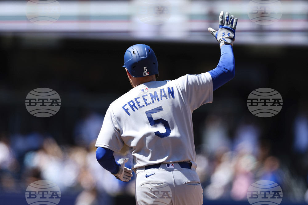 Los Angeles Dodgers' Freddie Freeman waves as he runs the bases after hitting a solo home run against the San Diego Padres in the sixth inning of a baseball game Sunday, Aug. 24, 2025, in San Diego. (AP Photo/Derrick Tuskan)
