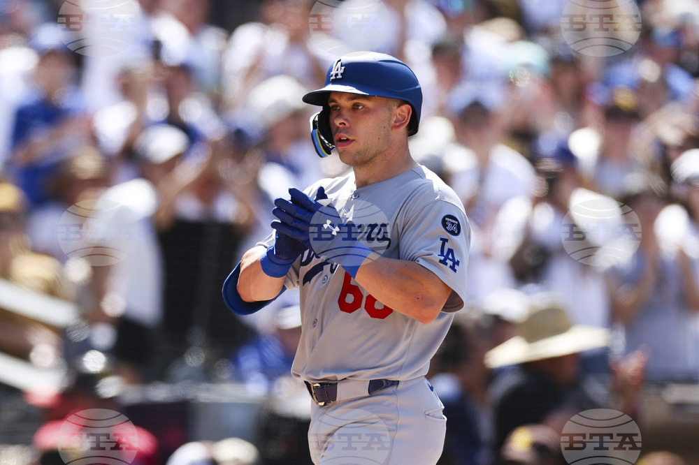 Los Angeles Dodgers' Alex Freeland (76) celebrates as he runs the bases after hitting a solo home run against the San Diego Padres in the eighth inning of a baseball game Saturday, Aug. 23, 2025, in San Diego. (AP Photo/Derrick Tuskan)
