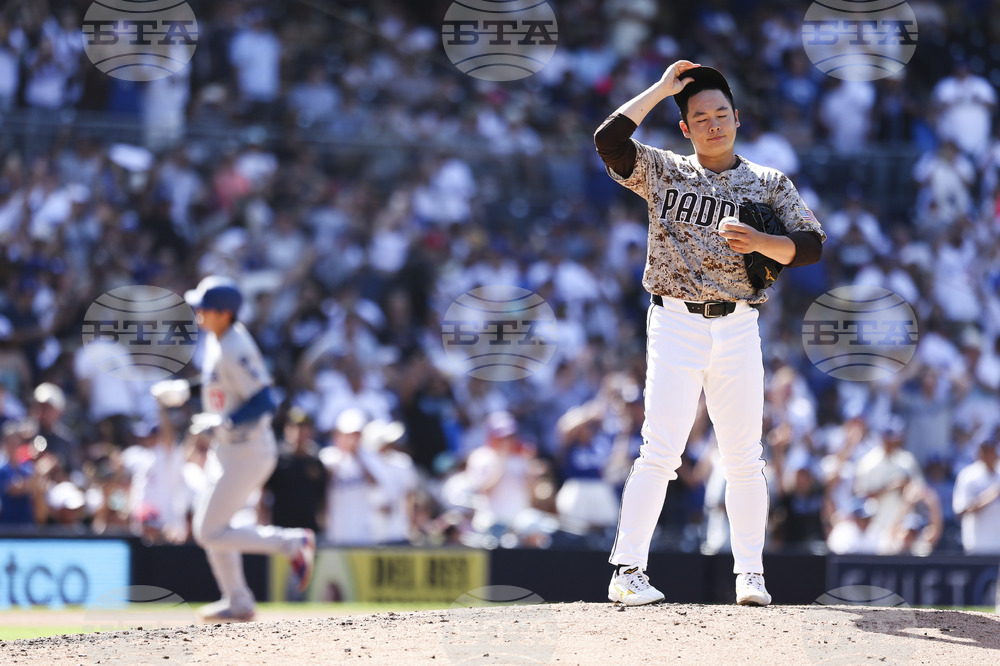 San Diego Padres relief pitcher Yuki Matsui, right, reacts after giving up a solo home run to Los Angeles Dodgers' Shohei Ohtani, background, in the ninth inning of a baseball game Sunday, Aug. 24, 2025, in San Diego. (AP Photo/Derrick Tuskan)