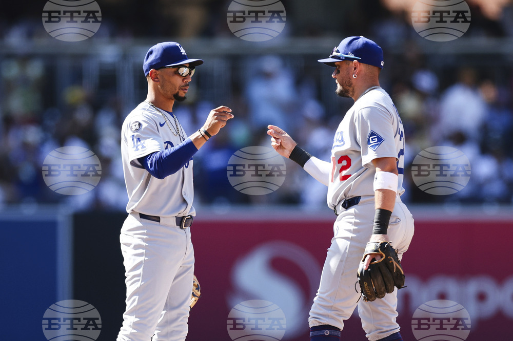 Los Angeles Dodgers' Mookie Betts, left, celebrates with Miguel Rojas after the team defeated the San Diego Padres in a baseball game Sunday, Aug. 24, 2025, in San Diego. (AP Photo/Derrick Tuskan)