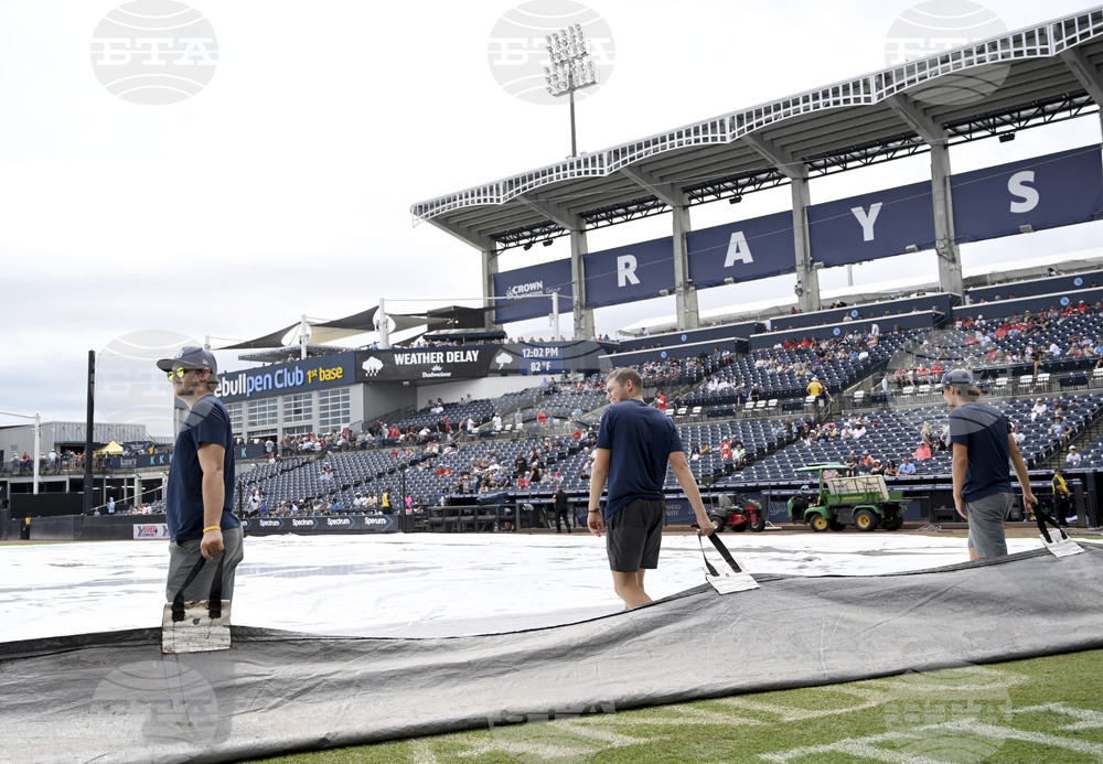 Tampa Bay Rays' grounds crew prepare to remove the tarp during a wether delay before the start of a baseball game agains the St. Louis Cardinals Sunday, Aug. 24, 2025, in Tampa, Fla. (AP Photo/Jason Behnken)