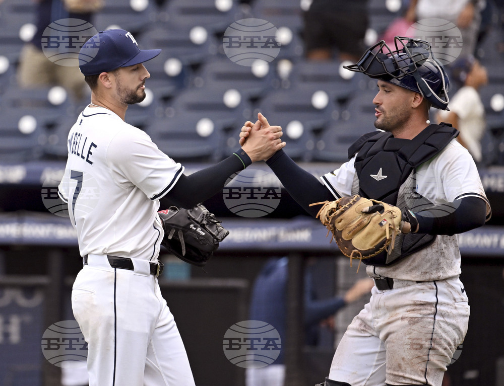 Tampa Bay Rays pitcher Brian Van Belle, left, and catcher Nick Fortes, right, celebrate after a baseball game against the Louis Cardinals, Sunday, Aug. 24, 2025, in Tampa, Fla. (AP Photo/Jason Behnken)