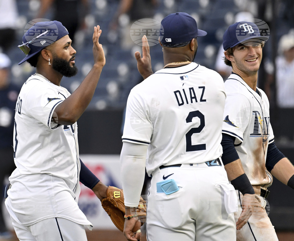 Tampa Bay Rays Junior Caminero, left, Yandy Díaz (2) and Carson Williams, right, celebrate after a baseball game against the St. Louis Cardinals, Sunday, Aug. 24, 2025, in Tampa, Fla. (AP Photo/Jason Behnken)