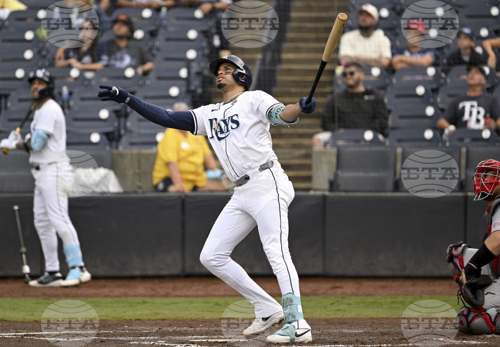 Tampa Bay Rays' Junior Caminero, left, rounds the bases after hitting a grand slam during the fifth inning of a baseball game against the St. Louis Cardinals, Sunday, Aug. 24, 2025, in Tampa, Fla. (AP Photo/Jason Behnken)