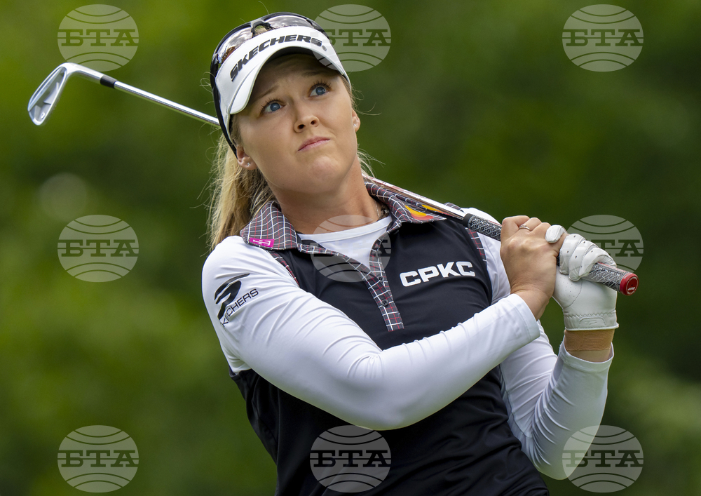Brooke Henderson, of Canada, watches her tee shot as she picks up her tee on the first hole in the final round of the Canadian Women's Open at Mississauga Golf and Country Club in Mississauga, Ontario, on Sunday August 24, 2025. (Frank Gunn/The Canadian Press via AP)