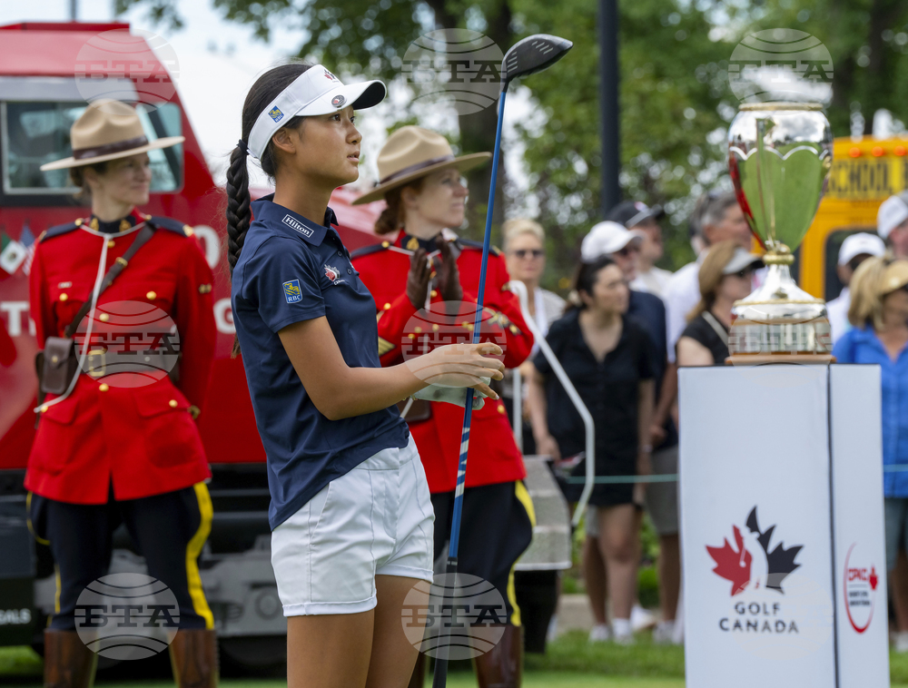 Aphrodite Deng, of Canada, watches her tee shot on the first hole in the final round of the Canadian Women's Open at Mississauga Golf and Country Club in Mississauga, Ontario, on Sunday, August 24, 2025. (Frank Gunn/The Canadian Press via AP)