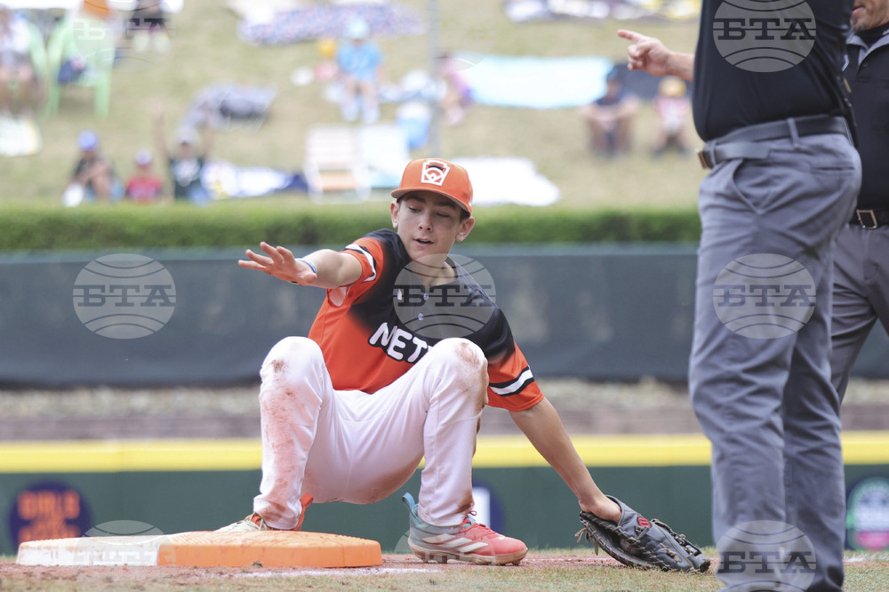 Fairfield, Conn.'s SJ Taxiltaridis steps on first base for the final out of the Little League World Series third place baseball game against Aruba, Sunday, Aug. 24, 2025, in South Williamsport, Pa. (AP Photo/Jared Freed)