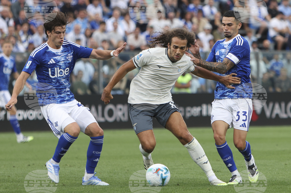 Como's Anastasios Douvikas, left, controls the ball from Lazio's Mattéo Guendouzi during a Serie A soccer match between Como and Lazio at the G Sinigaglia Stadium in Como, northern Italy, Sunday, Aug. 24 2025. (Antonio Saia/LaPresse via AP)