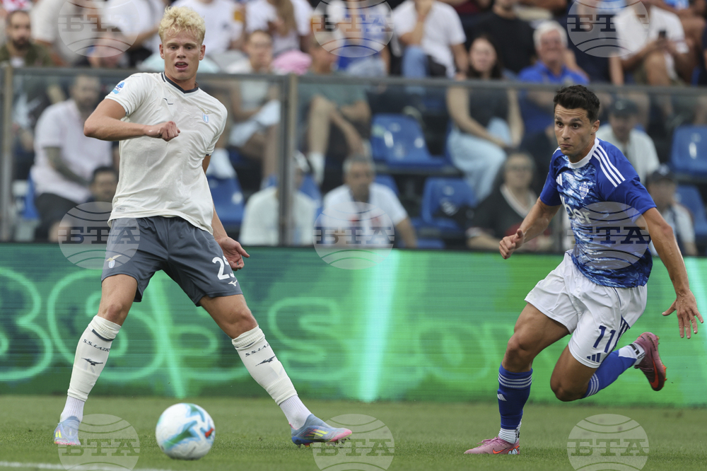Lazio's Oliver Provstgaard Nielsen, left, and Como's Anastasios Douvikas vie for the ball during a Serie A soccer match between Como and Lazio at the G Sinigaglia Stadium in Como, northern Italy, Sunday, Aug. 24 2025. (Antonio Saia/LaPresse via AP)