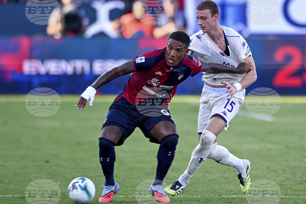Cagliari's Adam Obert, left, controls the ball ahead of Fiorentina's Dodô during a Serie A soccer match between Cagliari and Fiorentina at the Unipol Domus in Cagliari, Italy, Sunday, Aug. 24 2025. (Gianluca Zuddas/LaPresse via AP)