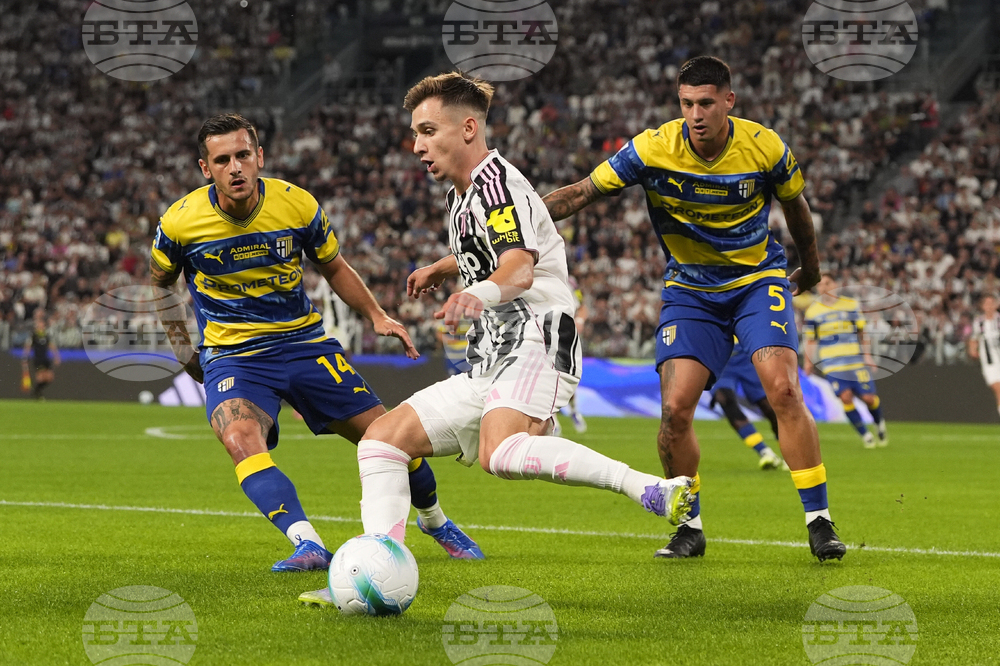Juventus's Francisco Conceição, center, vies for the ball with Parma's Emanuele Valeri, left, and Parma's Lautaro Valenti during a Serie A soccer match between Juventus and Parma at the Juventus Stadium in Turin, northern Italy, Sunday, Aug. 24, 2025. (Fabio Ferrari/LaPresse via AP)