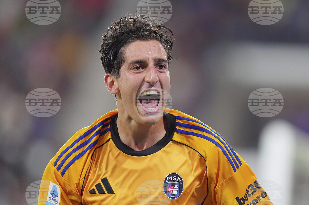 Pisa's Samuele Angori reacts during the Italian Serie A soccer match between Atalanta and Pisa at Gewiss stadium in Bergamo, Italy, Sunday, Aug. 24, 2025. (Spada/LaPresse via AP)