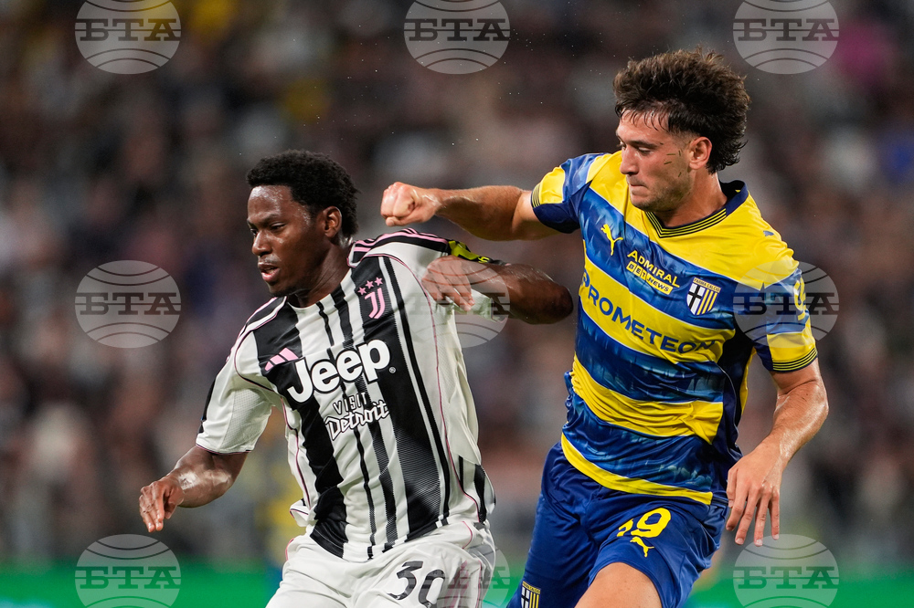 Juventus's Lloyd Kelly, left, fights for the ball with Parma's Mateo Pellegrino during the Italian Serie A soccer match between Juventus and Parma at the Juventus Stadium in Turin, Italy, Sunday, Aug. 24, 2025. (Fabio Ferrari/LaPresse via AP)