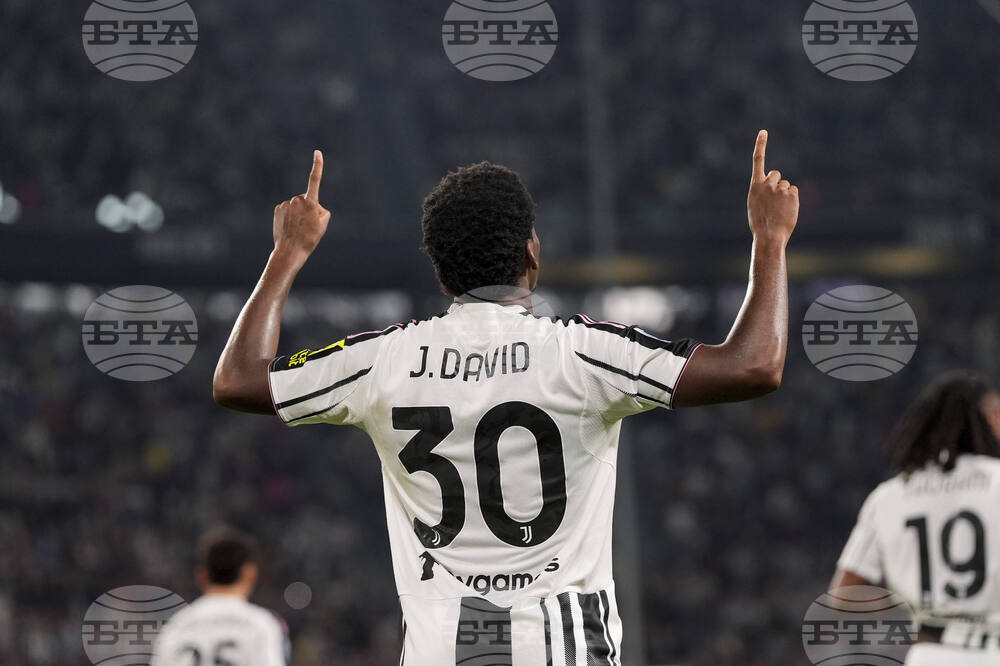 Juventus's Jonathan David celebrates after scoring the first goal for his team during the Italian Serie A soccer match between Juventus and Parma at the Juventus Stadium in Turin, Italy, Sunday, Aug. 24, 2025. (Fabio Ferrari/LaPresse via AP)
