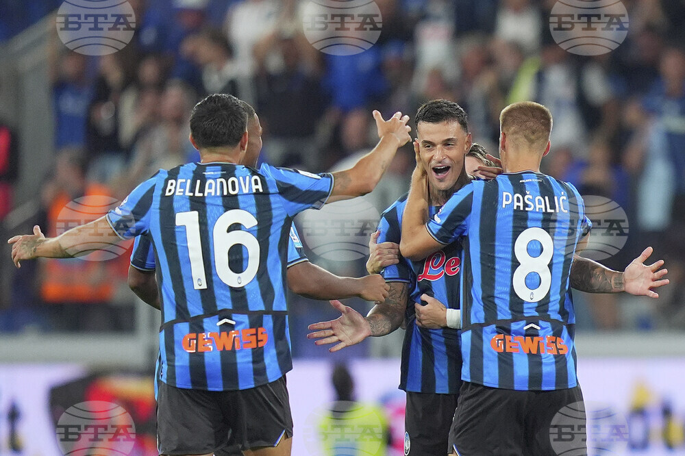 Atalanta's Gianluca Scamacca, center right, celebrates after scoring during the Italian Serie A soccer match between Atalanta and Pisa at Gewiss Stadium in Bergamo, Italy, Sunday, Aug. 24, 2025. (Spada/LaPresse via AP)