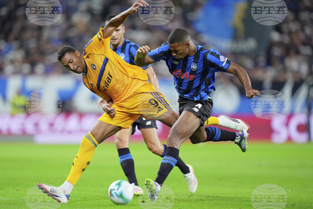 Atalanta's Gianluca Scamacca kicks the ball midair during the Italian Serie A soccer match between Atalanta and Pisa at Gewiss stadium in Bergamo, Italy, Sunday, Aug. 24, 2025. (Spada/LaPresse via AP)