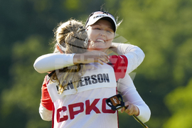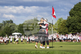 Brooke Henderson, right, of Canada, hugs her caddie, and sister, Brittany Henderson, left, after winning the Canadian Women's Open golf tourrnament on the 18th hole in Mississauga, Ontario, Sunday Aug. 24, 2025. (Frank Gunn/The Canadian Press via AP)