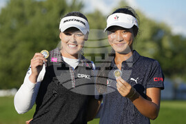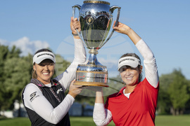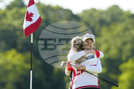 Brooke Henderson, left, of Canada, celebrates winning the Canadian Women's Open alongside low amateur Aphrodite Deng, of Canada, at Mississauga Golf and Country Club in Mississauga, Ontario, on Sunday, August 24, 2025. (Frank Gunn/The Canadian Press via AP)