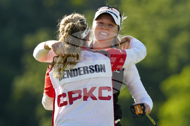 Brooke Henderson, of Canada celebrates, after winning the Canadian Women's Open golf tournament on the 18th hole in Mississauga, Ontario, Sunday, Aug. 24, 2025. (Frank Gunn/The Canadian Press via AP)
