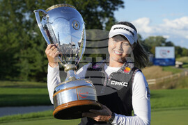 Brooke Henderson, of Canada, holds the CPKC Championship Trophy after winning the Canadian Women's Open at Mississauga Golf and Country Club in Mississauga, Ontario, on Sunday, August 24, 2025. (Frank Gunn/The Canadian Press via AP)