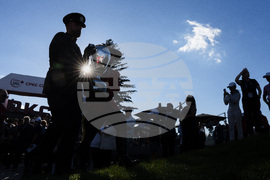 Volunteers await the presentation of the CPKC Trophy to Canada's Brooke Henderson following her win at the CPKC Women's Open golf tournament at the Mississauga Golf and Country Club in Mississauga, Ontario, Sunday, Aug. 24, 2025. (Thomas Skrlj/The Canadian Press via AP)
